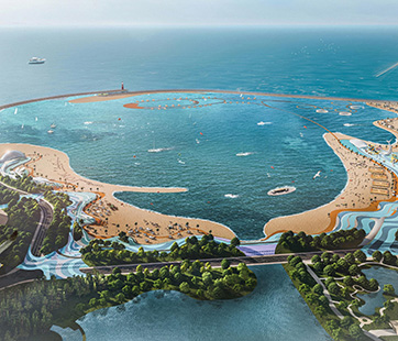 該項目位于月亮灣旅游度假區海堤外側,以海濱文體旅游綜合體為定位,以2012年四條鯨魚擱淺新灘鹽場附近事件為引,結合古黃河文化和海洋文化,構建以“鯨魚沙灘”為主題的IP。